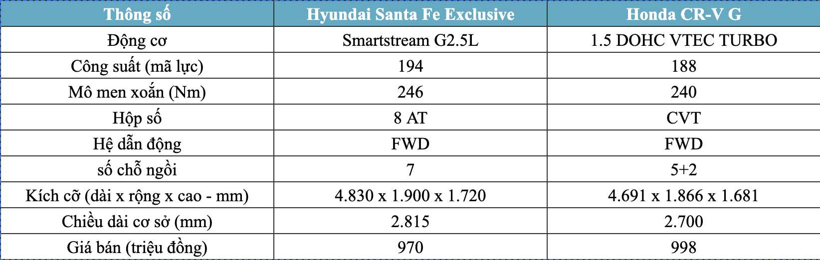 Honda CR-V sử dụng động cơ 1.5 DOHC VTEC TURBO công suất 188 mã lực, mô men xoắn 240 Nm/1.700 – 5.000. Như vậy, Santa Fe có công suất mạnh hơn Honda CR-V một chút, ngoài ra, so về kích cỡ hay chiều dài cơ sở thì Santa Fe vượt trội so với CR-V. Đây là điều dễ hiểu khi Sante Fe được định vị ở phân khúc trên.